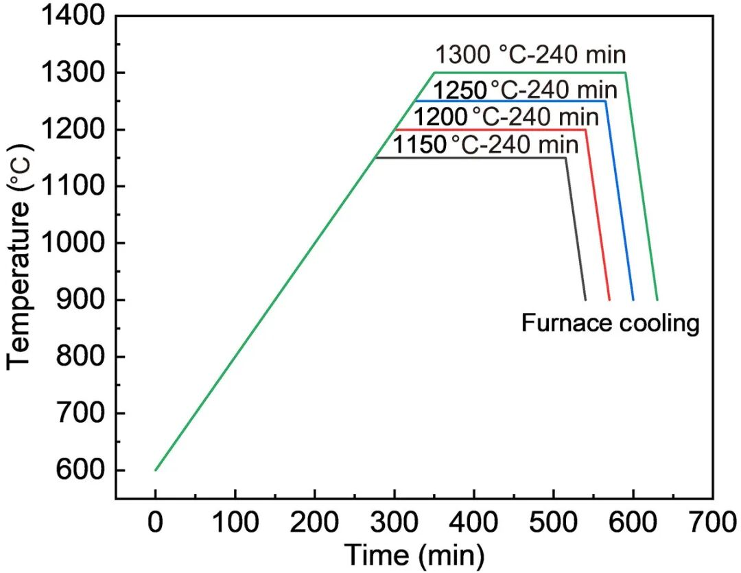 用于力学性能和微观结构表征的坯体尺寸为40 mm×5 mm×4 mm(长×宽×高)。激光功率为150 mW,扫描速度为3000 mm·s-1,层厚为50 μm。将通过SLA工艺制备的陶瓷坯体放入马弗炉中进行脱脂和烧结,以去除聚合物树脂成分并获得致密的陶瓷部件。脱脂阶段根据样品的TG-DTG曲线进行,将样品从室温加热至600 ℃。此阶段的升温速率设定为0.5 ℃·min-1,并在180 ℃、275 ℃、379 ℃和510 ℃下各保温2 h。超过600 ℃后,进入高温烧结阶段。在此阶段,升温速率增加至2 ℃·min-1,最终烧结温度设定为1150 ℃、1200 ℃、1250 ℃和1300 ℃。图1展示了烧结过程的细节。
