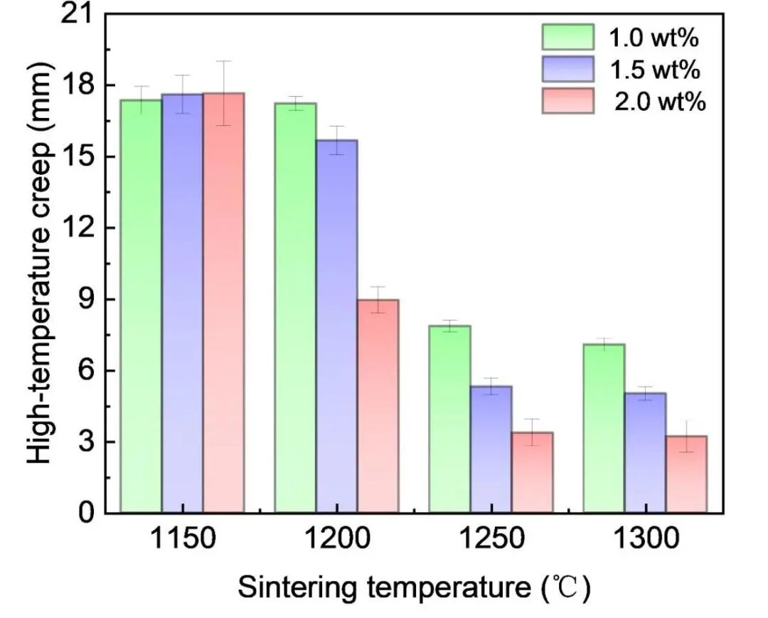 陶瓷型芯的高温抗蠕变性能主要由石英玻璃在高温下的粘性流动引起。当陶瓷型芯在浇注前方石英含量不足时,型芯的抗蠕变性能较差,在被熔融金属包围时容易软化变形。图4给出了不同纳米ZrO2含量的陶瓷型芯样品在不同烧结终温下的高温挠度数据。随着烧结终温的升高,陶瓷型芯的高温挠度逐渐减小。当烧结终温超过1250 ℃时,高温蠕变变形的降低变得不那么明显。在烧结终温1250 ℃时,不同纳米ZrO2含量的陶瓷样品的高温挠度分别为7.99 mm、5.31 mm和3.37 mm。与1200 ℃烧结的试样相比,不同纳米ZrO2含量的芯样的高温挠度分别降低了54.05%、66.11%和62.34%;当最终烧结温度进一步升高至1300 ℃时,不同纳米ZrO2含量的芯样的高温挠度进一步降低,分别为7.23 mm、5.01 mm和3.2 mm。