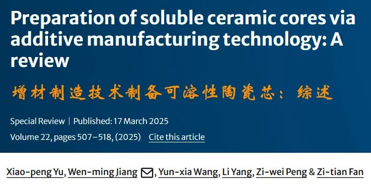 引用格式: Yu X P, Jiang W M, Wang Y X, et al. Preparation of soluble ceramic cores via additive manufacturing technology: A review. China Foundry, 2025, 22(5): 507-518. https://doi.org/10.1007/s41230-025-4210-2