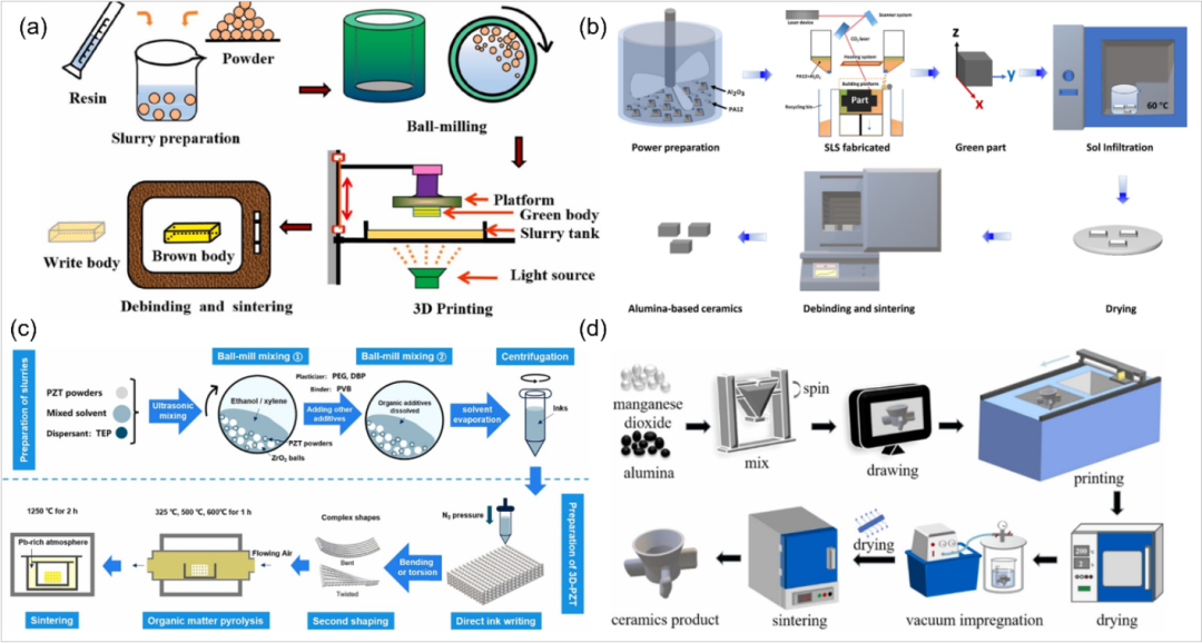 浆料直写技术:通过高压挤出高固含量陶瓷浆料,按预定路径层层堆积成形,设备成本低。浆料直写技术设备成本低、可在室温下成形、支持多材料打印。然而陶瓷浆料固含量高会导致烧结收缩率低,该技术制备的零件成形件表面粗糙度相对较高。