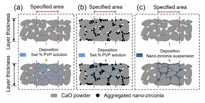 以重质碳酸钙(HCC)为原料,采用微滴喷射粘结成形技术制备陶瓷型芯,对坯件使用纳米ZrO2分散液真空浸渗处理,高温烧结后获得具有高强度以及良好可溶性的陶瓷型芯。重质碳酸钙给在高温下分解产生CaO/MgOCaO在高温下与纳米ZrO2颗粒发生反应生产CaZrO3CaZrO3颗粒间可形成紧密的烧结颈,使得陶瓷型芯具有较高的强度。烧结后的陶瓷型芯内部含有CaO/MgO,且两者皆可与水反应,故该方法制备得到的陶瓷芯可溶于水。
