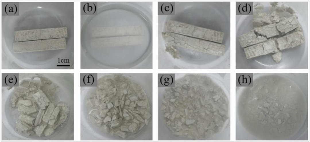 C/S比为2.45时,陶瓷型芯在1,200 °C烧结后展现出良好的分散性。此外,随着水温升高,陶瓷型芯的溃散速度加快,使其适用于铝镁合金铸件的替代型芯。图7展示了不同C/S比陶瓷型芯经1,200 °C烧结2小时后的溃散性能对比。