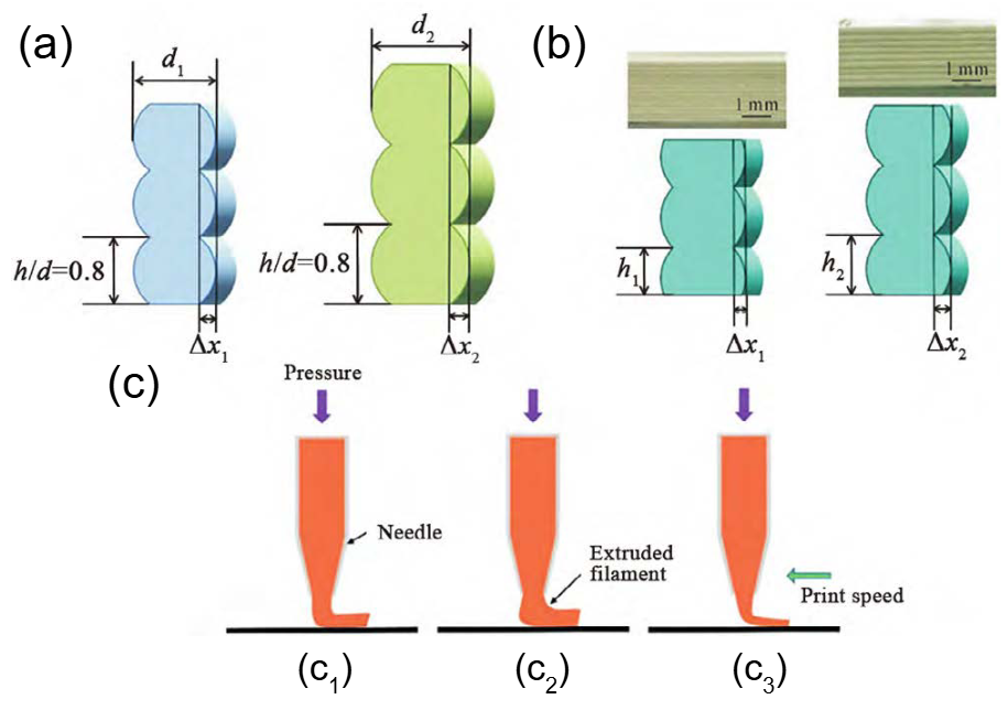 4 不同工艺参数对坯体表面粗糙度影响模型:(a) 不同针头内径挤出丝堆积对坯体表面粗糙度影响模型 (d1(b) 不同层高/内径比值对坯体表面影响(h1(c) 不同打印速度对挤出丝影响: (c1) 挤出平衡;(c2) 过挤出;(c3) 欠挤出