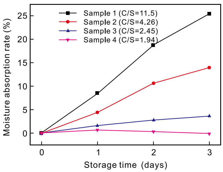 CaCO3SiO2为原料,采用直写成型技术制备可溶陶瓷型芯。他们研究了CaO-SiO2摩尔比(C/S)对生坯及烧结样品性能与分散性的影响。研究发现,随着C/S比增大,可溶陶瓷型芯的吸湿率逐渐升高。研究表明,当C/S比较低时,烧结型芯中存在更多Ca₂SiO4,而CaO含量较少,从而增强了型芯的强度与抗水化性能。随着C/S比升高,CaO含量增加。由于CaO 具有强吸湿性,这会显著降低可溶性陶瓷型芯的耐水性能。通过浸渍纳米ZrO2分散液,ZrO2CaO反应生成不溶于水的锆酸钙(CaZrO3),这既降低了陶瓷型芯内部的CaO含量,又能有效提升其耐水性能。