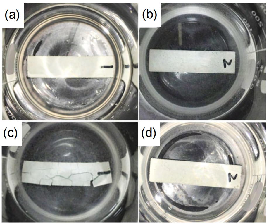 7 1,200 °C烧结2小时后陶瓷型芯的溃散性:样品1C/S=2.45(a) 和样品2C/S=1.94(b) 初始状态;样品1C/S=2.45(c) 和样品2C/S=1.94(d) 在水中浸泡110分钟后状态